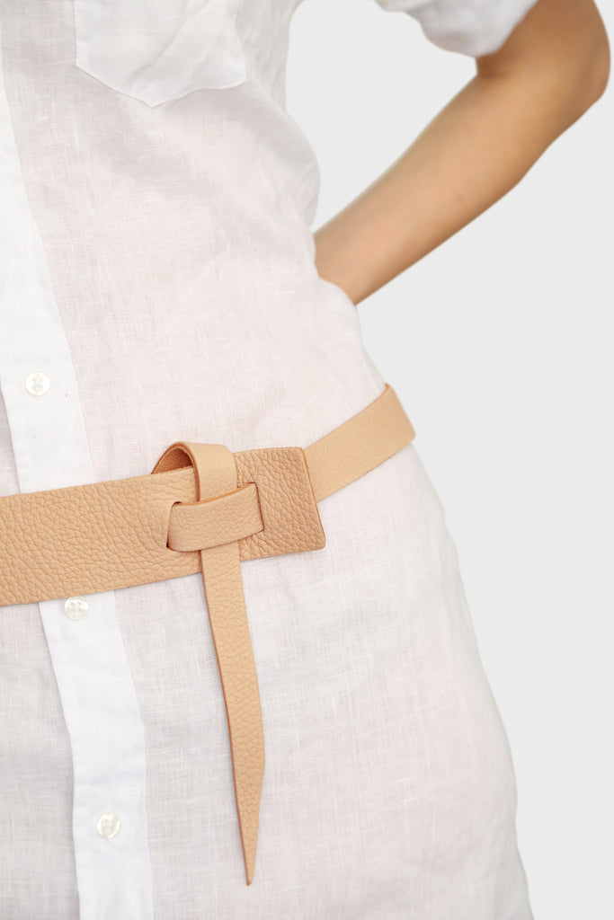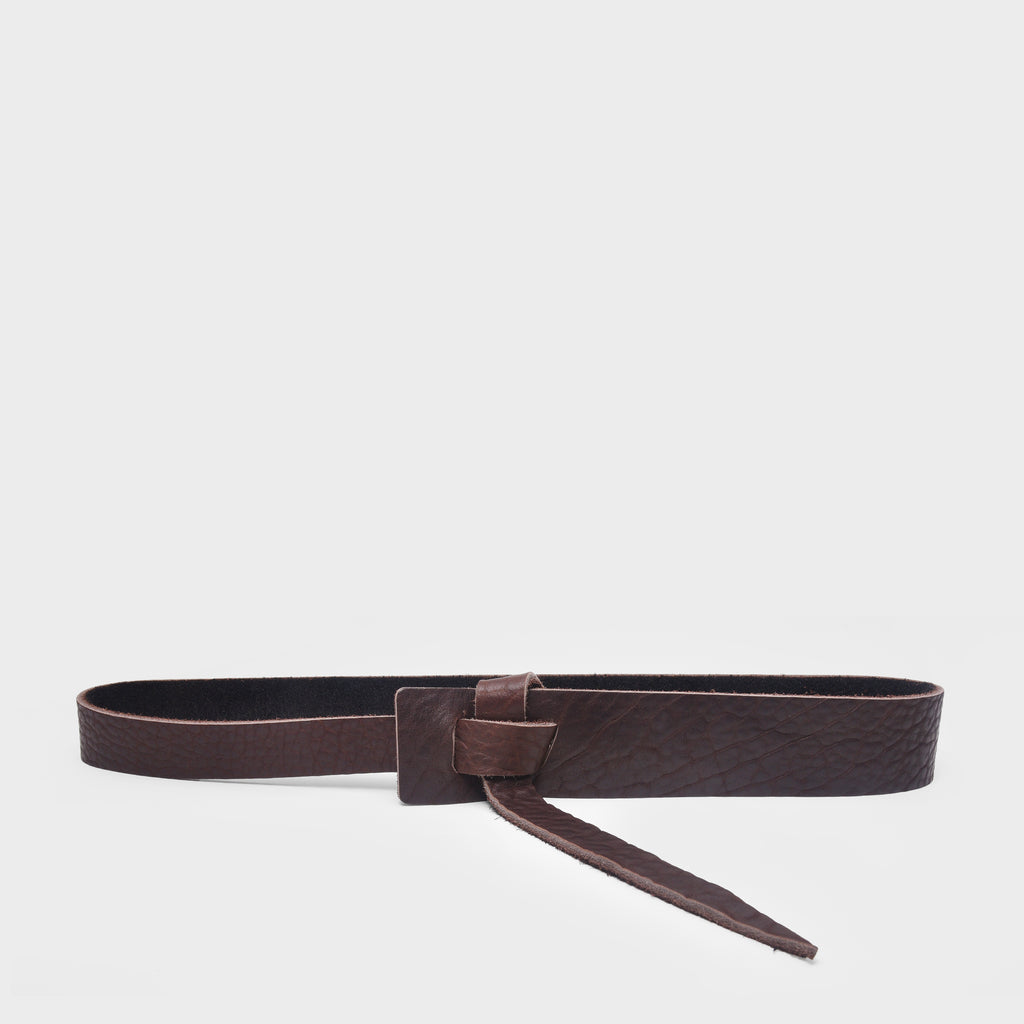 What could we do with just our sublime tumbled leather and no hardware? Turn it into a belt of course! With a twist and tug you will be surprised how this simple style– a slimmer version of our Maze Hip Belt– will elevate any outfit. Intuitive and practical, you are on your way to effortless style.